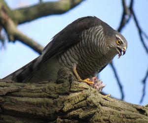 Питаются ястребы-перепелятники мелкими птицами, но иногда лакомятся грызунами или насекомыми. Самка обычно радует свою пернатую семью воронами или рябчиками. Нападают из засады или подстерегают свою добычу в полёте, пролетая рядом с землёй. Как только наступает весна, пара строит новое жилище, которое располагают в кроне дерева у ствола. Птицы постоянно привязаны к своему гнезду и навещают его в марте или апреле. Высиживает своих птенцов в течение 32-35 дней, когда появляется второе или третье яйцо, поэтому обычно в кладке не больше 6 беловатых яйца с бурыми пятнами. Пока мама-самка ухаживает за птенцами, всю семью кормит самец, через некоторое время на охоту выходит и самка. Птенцы появляются на свет в белых нарядах, немного с бежевым оттенком. Их поведение, как у маленьких детей, быстро меняется: от мягкого и спокойного до агрессивного характера. Выкармливанием птенцов самка занимается почти месяц, а затем родители начинают брать птенцов с собой.